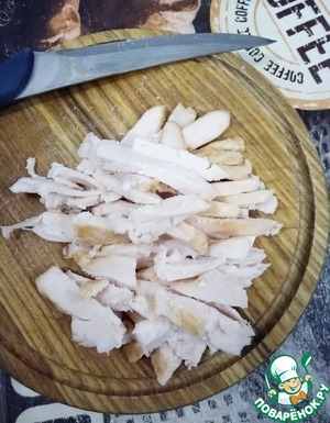Куриное филе режим соломкой. Мясо можно использовать любое: мы пробовали и варёную говядину и копчённую свиную грудинку, но семье больше нравиться с копчённым куриным филе.