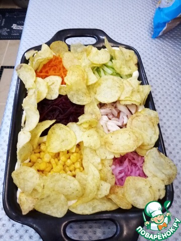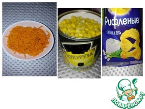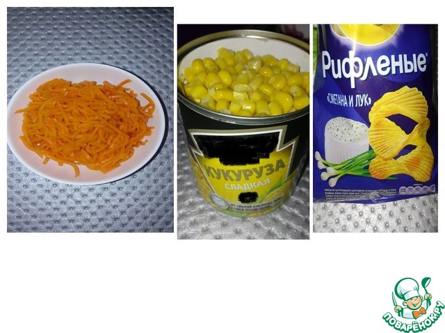 Морковь я брал покупную- не было времени самому делать. Если морковь длинная порезать пополам. Кукурузу "освобождаем" от жидкости. Чипсы- самая маленькая пачка, а вкус.. Вам решать (у меня сметана с луком).