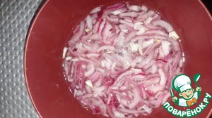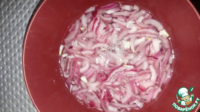 Маринуем лук (я брал ялтинский): готовим маринад, режем лук четверть кольцами и на час оставляем в маринаде. Если не нравиться в салатах маринованный лук, можно нарезанный лук ошпарить кипятком, избавимся от горечи. -