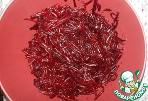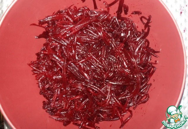 Свеклу варим, чистим, натираем длинно на тёрке для моркови по-корейски.