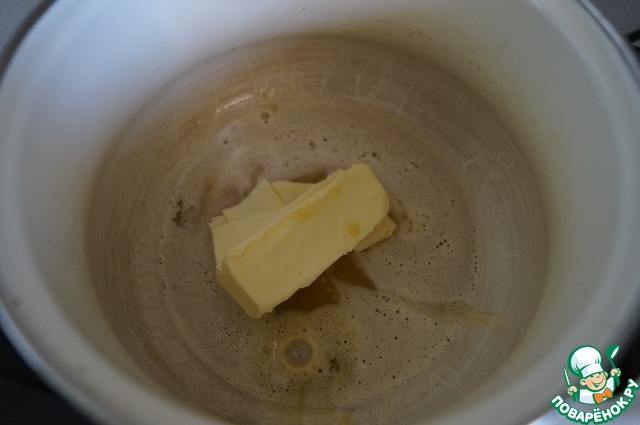 Переливаем получившуюся массу в кастрюльку и добавляем сливочное масло. Ставим на слабый нагрев и помешивая, растапливаем масло. Масса ни в коем случае не должна кипеть. Снимаем с нагрева.