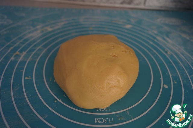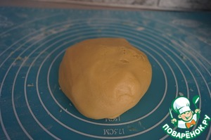 Вводим постепенно всю муку и вымешиваем тесто. Оно должно получиться гладким. Не забиваем тесто мукой, иначе готовые коржи получатся излишне жесткими. Заворачиваем готовое тесто в пленку и убираем в холодильник хотя бы на 2 ч., а лучше на ночь.