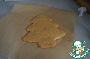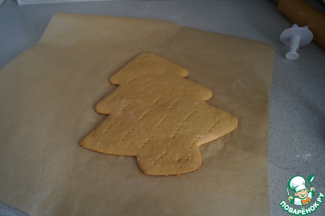 Готовое тесто делим на 3 части и раскатываем каждую в тонкий пласт. Вырезаем елочку по шаблону. Накалываем корж вилкой, чтобы не вздувался во время выпечки.