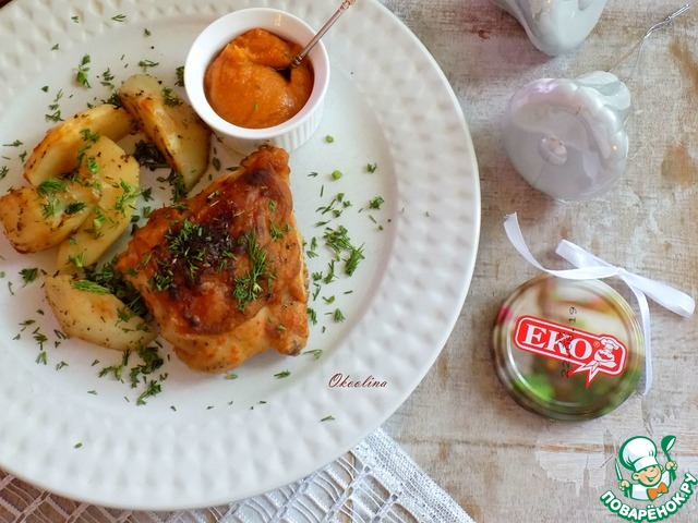 Куриные бёдра, замаринованные в кабачковой икре, майонезе и горчице с чесноком. Запечённые вместе с ароматным картофелем с прованскими травами, перцем кайен и оливковым маслом. Это блюдо не испортит праздничный новогодний стол и его можно подать в качестве горячего. Не обязательно для этого блюда брать бёдра, можно взять и целую курицу, грудку или окорочка.