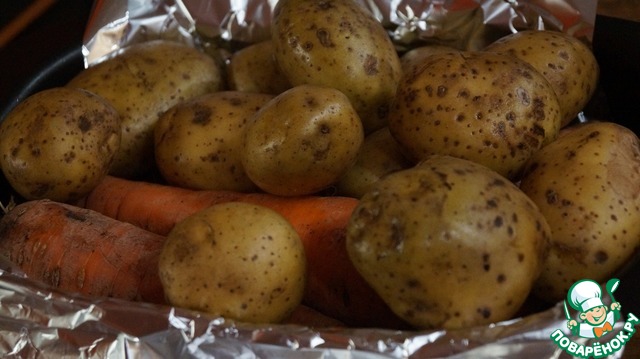 Слой картошки аккуратно залепляем слоем моркови, формируя "мандаринки". Готовые изделия выкладываем на блюдо, застеленное листьями салата или укропными веточками.