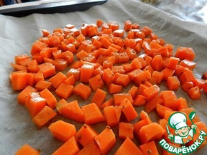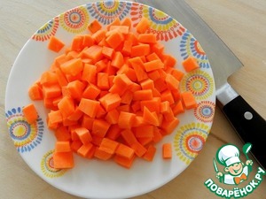 Одну среднюю морковь очистить, нарезать кубиками со стороной 0.5 см.