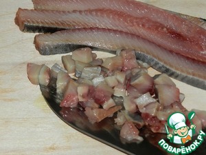 Половину филе одной слабосоленой сельди нарезать мелкими кубиками.