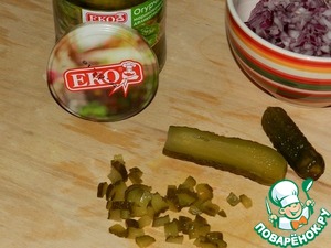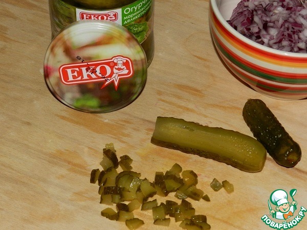 2-3 маринованных огурчика небольшого размера также измельчить.