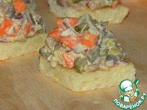 Ломтики батона подсушить на сухой сковороде или в духовке. Сверху выложить необходимое количество закуски, можно присыпать зеленью и...