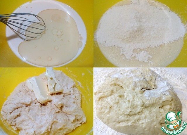 Следующим этапом влить растительное масло без запаха и частями, в три-четыре приема добавлять муку и перемешивать. Перед последним добавлением муки, в тесто вмешать размягченное сливочное масло и замешивать 3-4 минуты рукой, чтоб оно хорошо вмешалось. Затем высыпать оставшуюся муку на стол и продолжать замешивать тесто, вмешивая оставшуюся муку. Сначала 750 г, а затем смотреть по липкости теста. Тесто мягкое, но не липнущее к рукам.