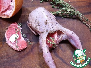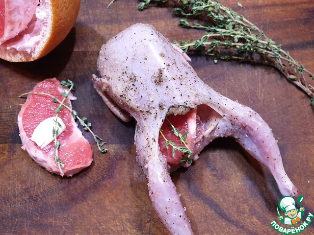 Внутрь каждой птички положите дольку грейпфрута (апельсина), немного чеснока и маленькую веточку тимьяна.
