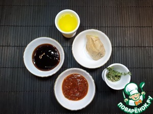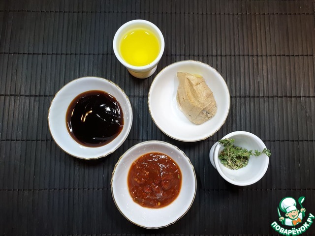 Пока запекаются перепела, приготовим глазурь из устричного соуса, оливкового масла, имбиря, острой аджики и листочков тимьяна.