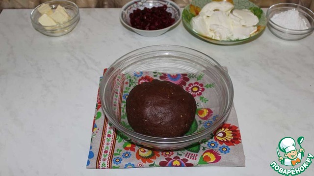 На пищевой пленке тесто раскатываем в пласт толщиной 5-7мм. Сверху выкладываем крем.