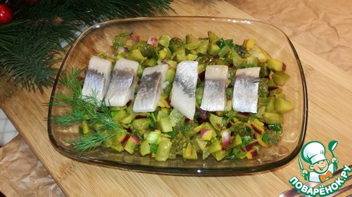 Филе сельди порезать кусочками и выложить сверху салата. Украсить на свой вкус.