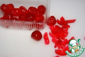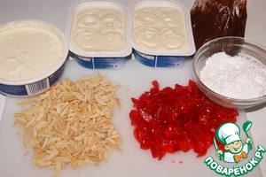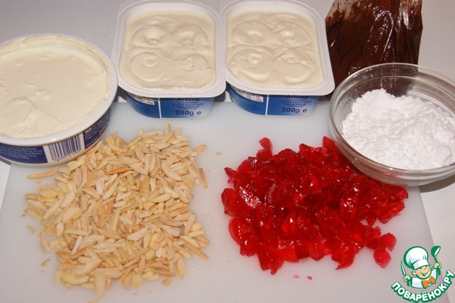 У меня не было сыра Рикотта, да и Маскарпоне нужно было срочно использовать, хотя, если бы в стране, где живу был жирный и не кислый творог, приготовила бы с ним. Вишню для коктейля заменила на засахаренную для выпечки, так экономичнее и вкуснее, как для меня. Сахарной пудры в следующий раз добавлю меньше - грамм 35-40.