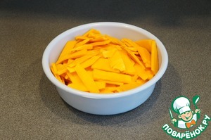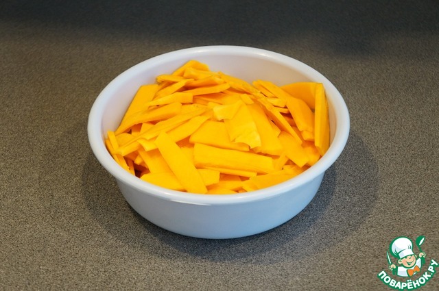 Порезать тонкими ломтиками. Вес мякоти без кожуры 400-450 граммов.