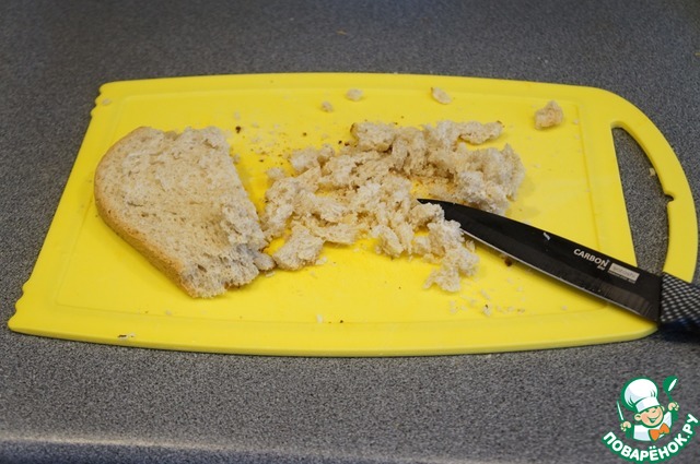 Хлеб порезать, если подсохший. Или сложить в пакет и помять скалкой, если совсем чёрствый. Должны получиться крупные крошки неодинакового размера.