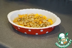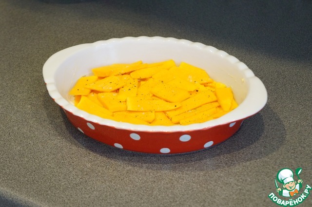 Форму для запекания смазать сливочным маслом, выложить несколько слоёв тыквы. Посолить, поперчить.