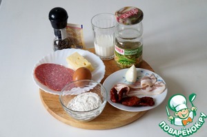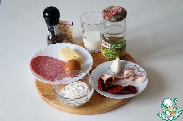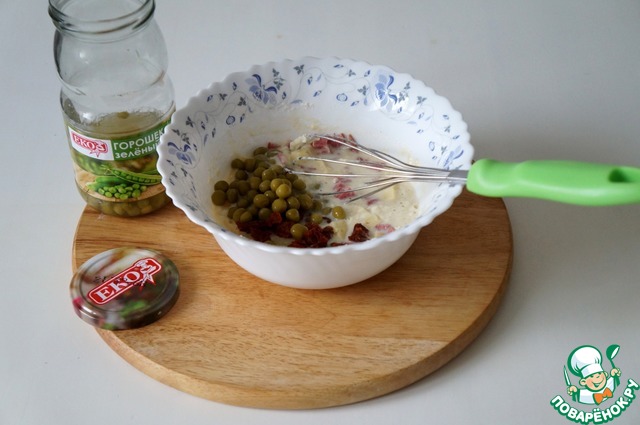 Добавьте начинку: колбасу, обжаренный с луком бекон, сыр. Всыпьте горошек без жидкости.