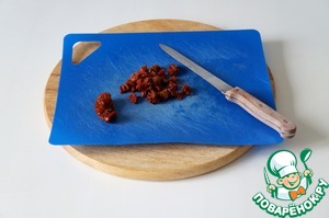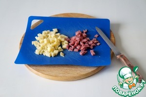 Порежьте колбасу и сыр кубиками размером примерно с горошину.