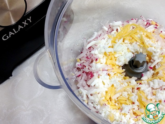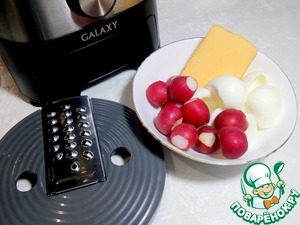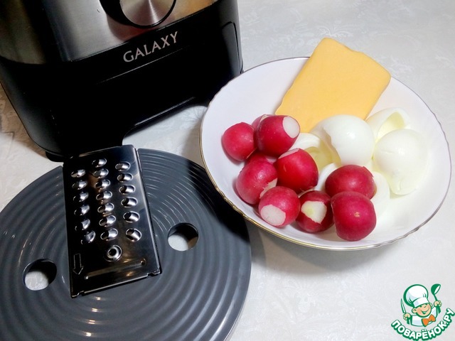 Для украшения блюда: от сыра отрезать две -три пластинки, проделать в них дырочки. Из редиски сделать мышек. Оставшиеся продукты, а так же белки от яиц, натереть на терке-насадке для комбайна GALAXY