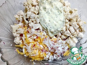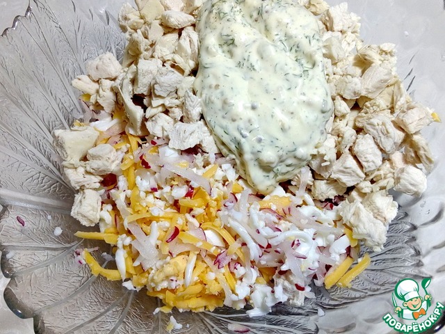Выкладываем содержимое в другую посуду, добавляем нарезанную куриную грудку и заправку. Все перемешиваем ложкой или лопаточкой.