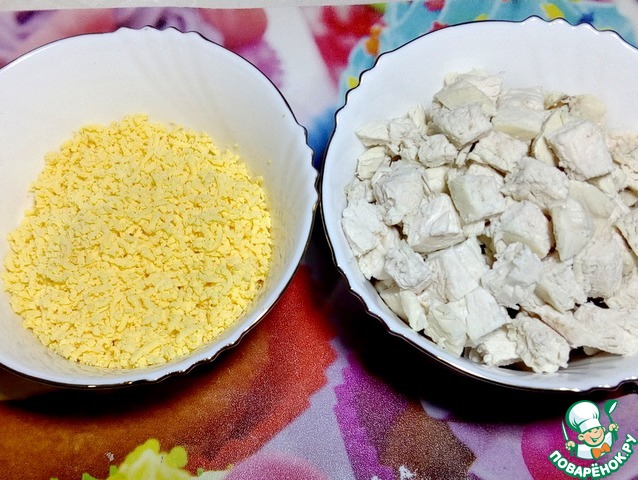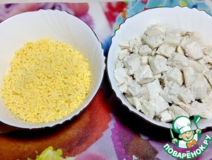Отделить белки яиц от желтков, желтки натереть на средней терке. Отварную курицу нарезать кубиками. Отставить.