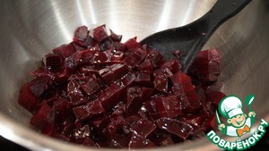 Дальше все просто. При помощи комбайна (или вручную) режем кубиком сначала свеклу. Сразу заправляем подсолнечным маслом. Не бойтесь, что масла покажется много, так и надо. Хорошо перемешиваем. Промасленная свекла меньше окрашивает другие ингредиенты. Не солим.