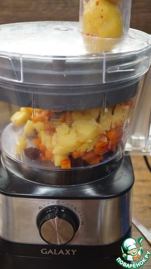 Далее режем кубиком морковь и картофель. Комбайн делает приготовление подобного салата молниеносным.