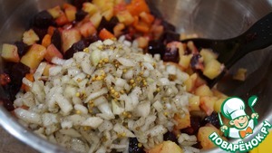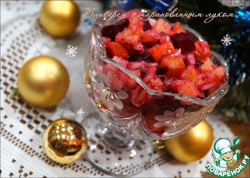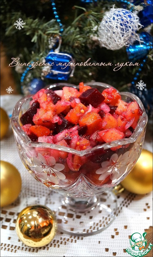 Основа основ этого винегрета - маринованный лук, который с успехом заменит нам и квашеную капусту, и маринованные огурцы. Пусть вас не пугает, что его много.