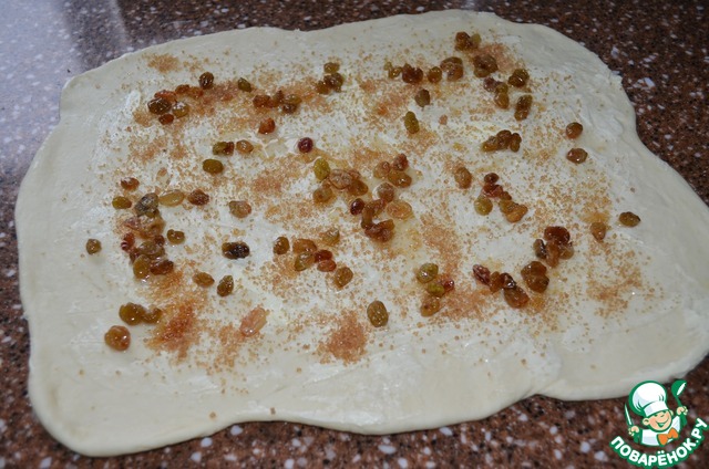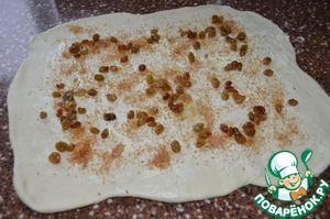 Рассыпать "коньячный" изюм. Свернуть рулетом. -