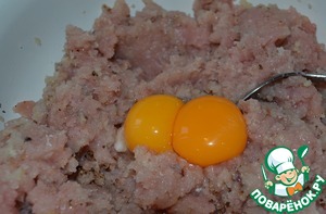 • Фарш посолить, поперчить, добавить желтки.