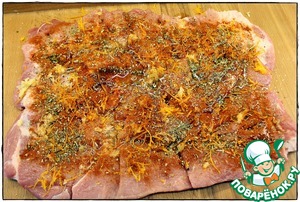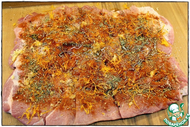 • Мясо посыпаем солью (на ваше усмотрение), берём апельсин, обязательно ошпариваем, натираем цедру без белой части на самой малой тёрке кашицей, наносим на мясо. Апельсин полностью очищаем, закрываем от удовольствия глаза и съедаем (этот шаг можно пропустить)... Натираем на тёрке 5-6 зубчиков чеснока, посыпаем двумя чайными ложками паприки, ароматными травками-муравками и наливаем 50 мл растительного масла. Этим всем нужно хорошо натереть сверху мясо.