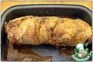 • Выдержав последние десять минут - достаём, снимаем фольгу, мясо поливаем выделившимся соком, снимаем сетку или марлю, нарезаем и подаём горячим на праздничный стол под возбуждённые возгласы гостей от распространяющегося аромата!!!