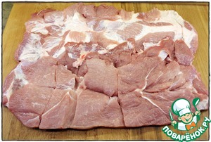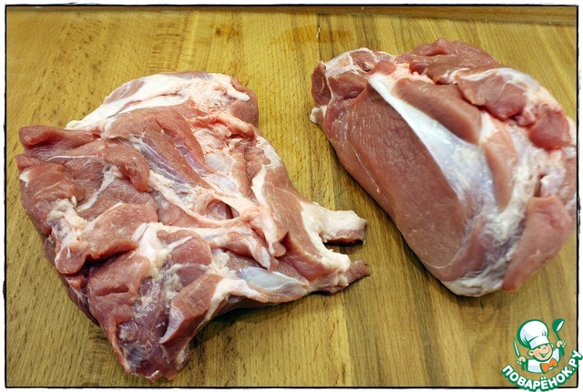• Моя свиная лопатка была одним длинным куском, я разрезал пополам. Можно взять два куска меньшим размером, а можно оставить цельным - это на Ваше усмотрение. Теперь наше мясо нужно разрезать вдоль по длине по горизонтали, но не прорезать до конца, раскрыть книжкой.