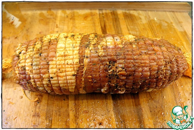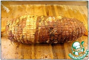 • Аккуратно сворачиваем мясо рулетом, посыпаем солью, специями (без чеснока), поливаем маслом и хорошо натираем.