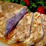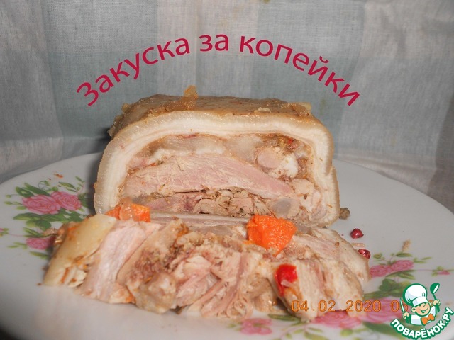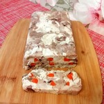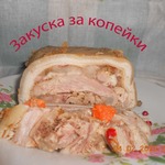 Я оставил в холодильнике на ночь. Утром достал вот такую красоту. Из формы закуска вынимается без проблем, очень хорошо нарезается тонкими ломтиками, а самое главное - очень вкусная, небольшая себестоимость, отличнейшая замена магазинным колбасным изделиям и ты знаешь что ешь!!!