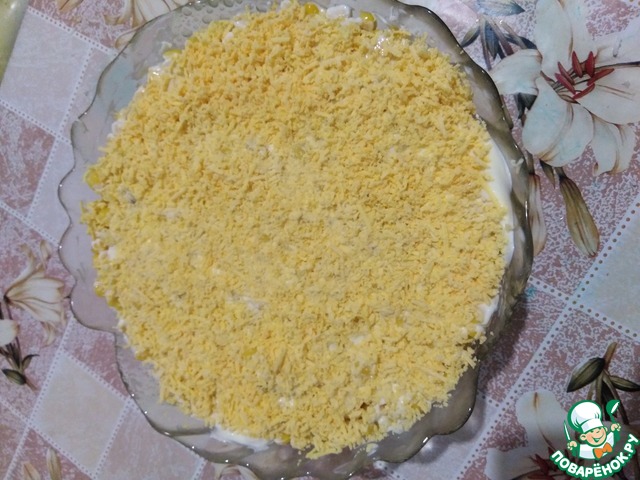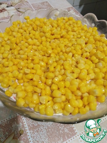С кукурузы сливаем воду и укладываем следующим слоем. Смазываем майонезом.