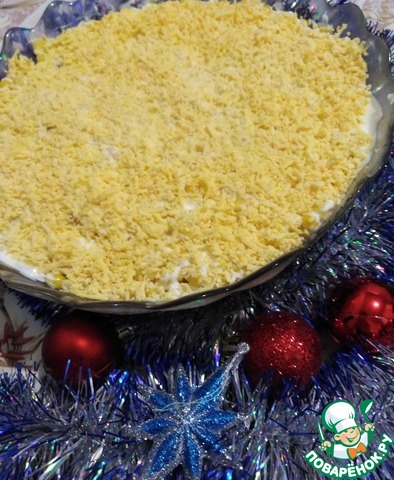 И завершающий этап, натереть желки, это будет верхушка салата. Поставить в холодильник на пару часов и можно наслаждаться.