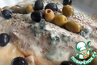 Скрутить тюрбан из сельди и скрепить край зубочисткой. Полить растительным маслом.