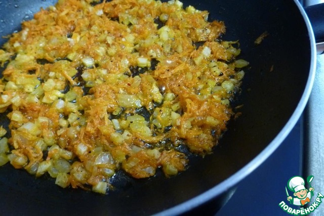 Лук и чеснок измельчить, морковь натереть на терке. Обжарить овощи до мягкости.