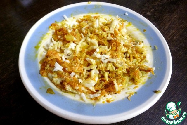 Натереть сыр на терке и смешать его с остывшими обжаренными овощами. Овощи я не солила, так как в начинке есть сыр.