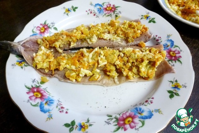 На филе сельди выложить начинку, слегка придавив к мясу.