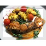 Отрезать голову, выпотрошить и аккуратно вырезать хребет, оставив оба филе на хвостике. Немного посолить и поперчить рыбку.