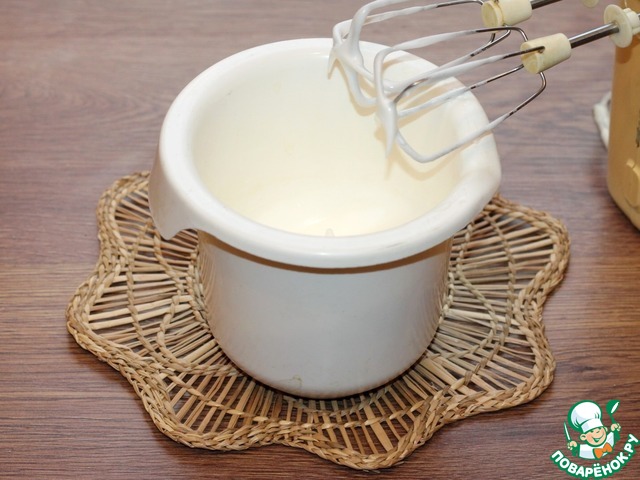 1. Приготовим тесто. Берем крупные куриные яйца и отделяем белки от желтков. Белки взбиваем с щепоткой соли. Затем добавляем тонкой струйкой 1 ст. л. сахара и взбиваем до мягких пиков.