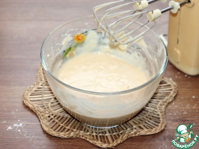 3. Муку смешиваем с разрыхлителем и просеиваем в масляную жидкую смесь. Взбиваем тесто миксером до однородности.