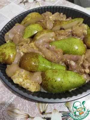 В форму для выпекания выложить замаринованные бедра и половинки груш. Полить сверху остатками маринада. Накрыть фольгой, запекать в разогретой до 180С духовке 25 минут, после чего фольгу открыть. Готовить еще минут 20 при температуре 200С.