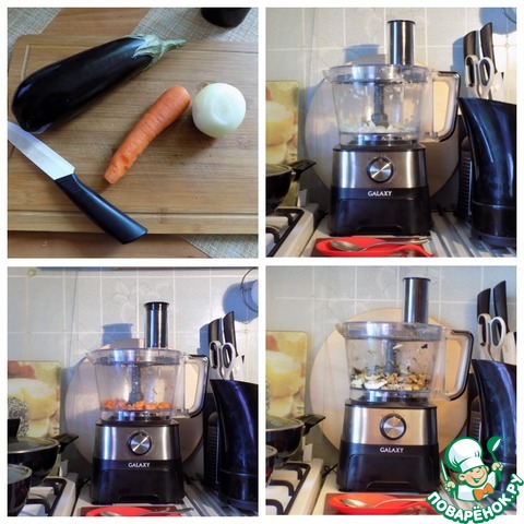 Готовим овощи для икры. Я овощи, кроме чеснока, нашинкую при помощи насадки для шинковки в кухонном комбайне GALAXY GL2300. Сначала лук, затем морковь и баклажан. Всё нашинкую по отдельности. Это очень быстро. Буквально для каждого овоща секунд по 15.