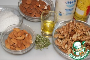 Миндаль крупный и помельче, грецкие орехи, сахар, свежий розмарин и острый перец, соль и оливковое масло - настоящая ореховая бомба, которая всем нам очень понравилась!