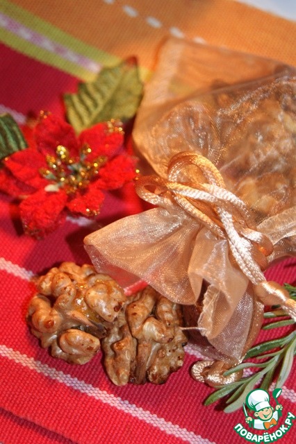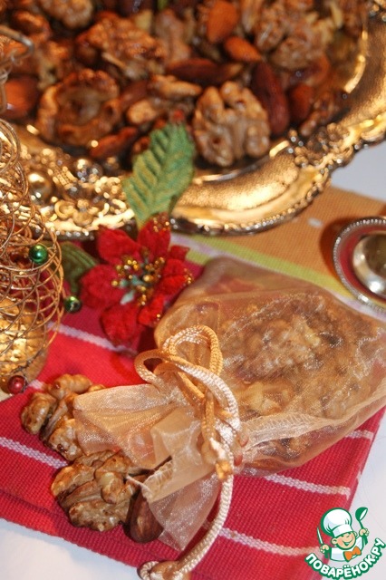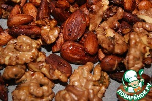 Быстро перемешать смесь и вылить на орехи, быстро перемешивая лопаткой, чтобы все орехи равномерно покрылись сиропом. Осторожно, не обожгитесь! -